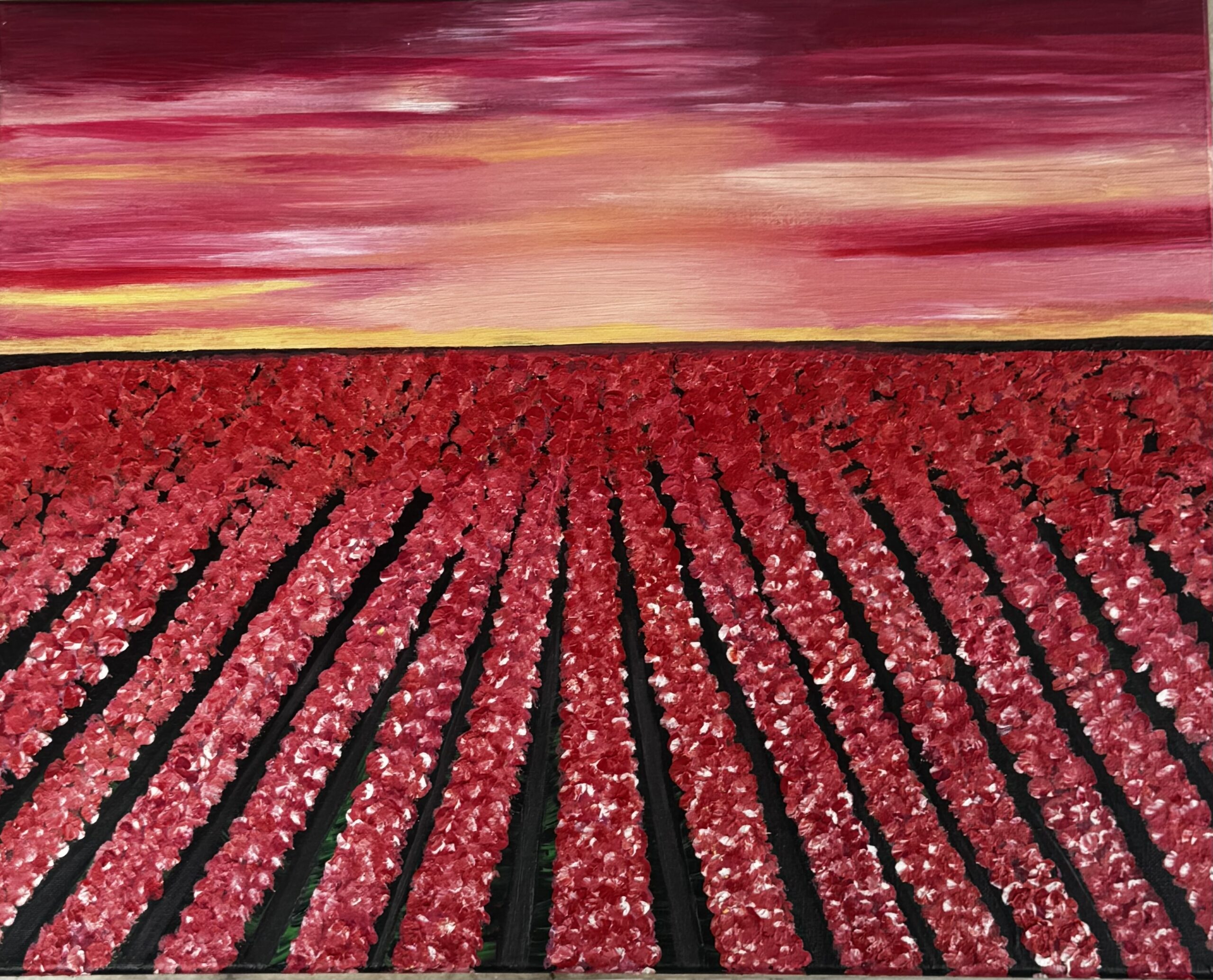 This painting is inspired by my own visit to the tulip fields near Amsterdam, where shades of pink and deep rose spread across the landscape under a glowing sunset sky. I watched the rows of blossoms stretch endlessly into the horizon, blending with the warm twilight. It was a peaceful moment that revealed nature’s beauty in its most vivid and unforgettable colors.