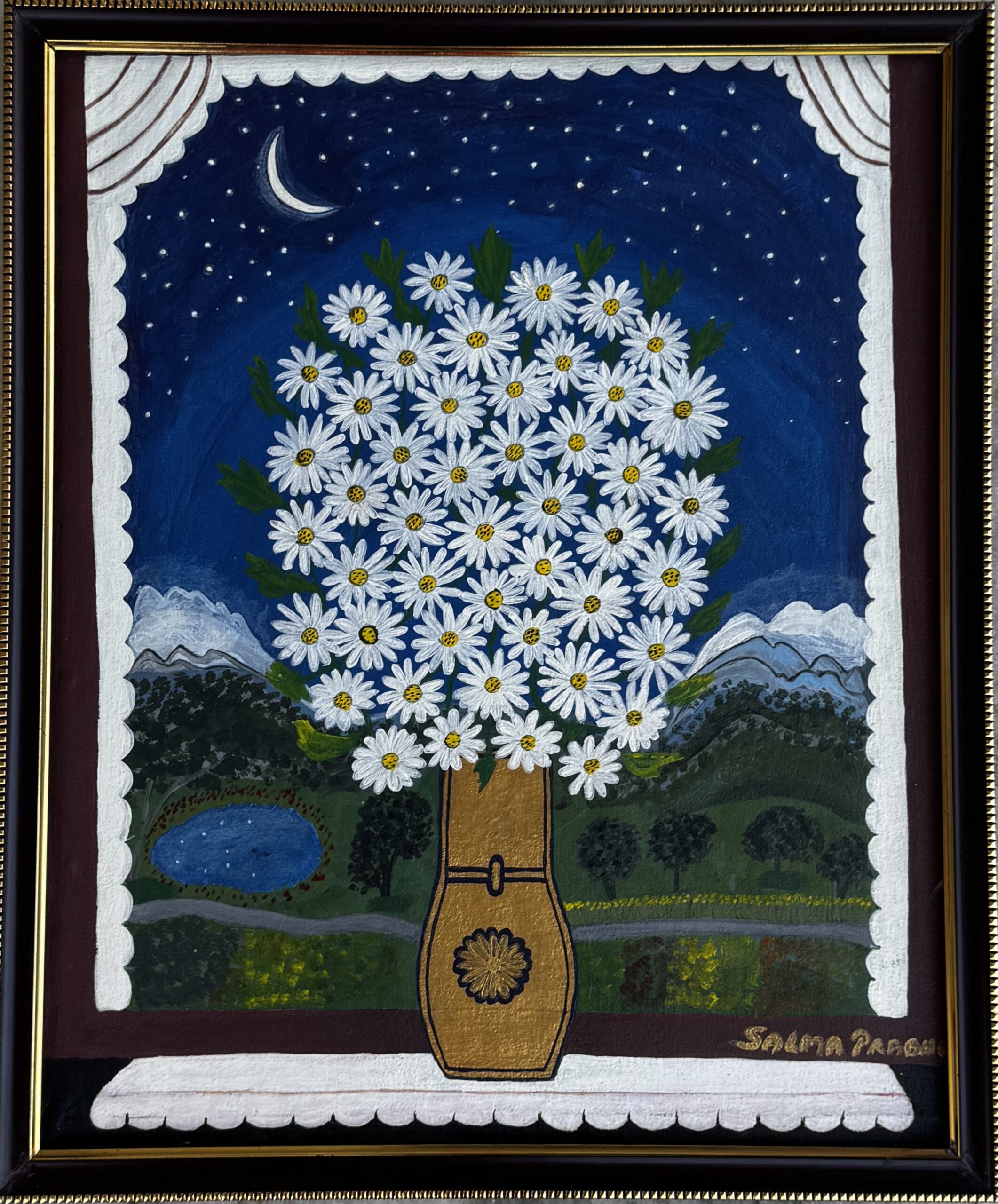 Under the soft glow of the moon, a vase of white daisies rests by the window, with peaceful mountains, a quiet pond, and a starry sky beyond. The painting captures the calm beauty of a gentle night. Wherever it is placed, it brings light, peace, and a touch of magic to the space around it.